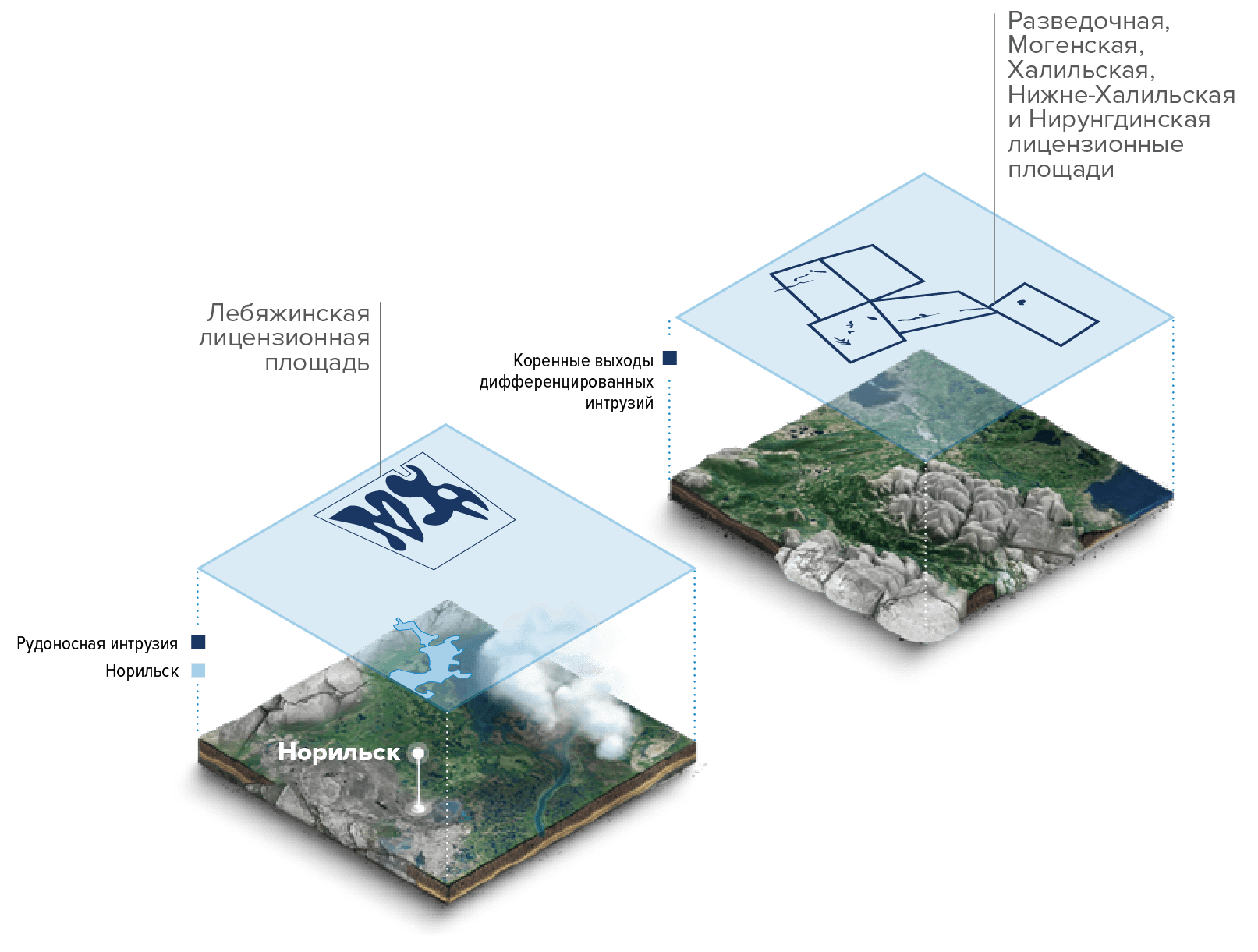 В 2014 году получены лицензии на право пользования недрами в целях геологического изучения — поиска и оценки месторождений сульфидных медно-никелевых руд на Лебяжнинской, Разведочной, Могенской, Халильской, Нижне-Халильской и Нирунгдинской площадях, расположенных в Таймырском Долгано-Ненецком муниципальном районе Красноярского края. Прошли экспертизу и утверждены проекты проведения поисковых работ. Ведутся поисковые работы, в том числе бурение скважин с целью заверки аномалий, выделенных ранее.